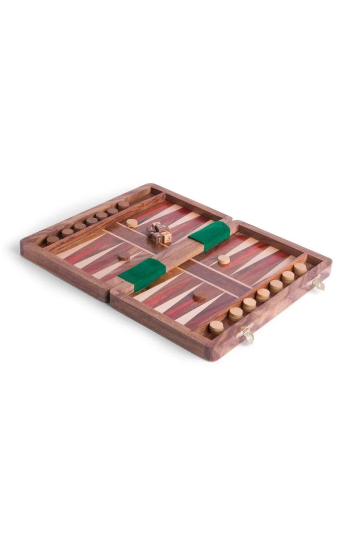 Immerse yourself in the craftsmanship of this 10×6-inch wooden backgammon set, thoughtfully handcrafted from exquisite wood. The addition of soft padded green felt to the hinges not only enhances its appearance but also adds a touch of sophistication to this elegantly simple design. Securely fastened with a pair of golden metal brass clips, this set ensures that your backgammon pieces remain intact and readily available for your next game. Included in this ensemble are a meticulously detailed board, complete sets of backgammon pieces (15 of each colour), four dice and one doubling dice, providing all the essential elements for your gaming enjoyment