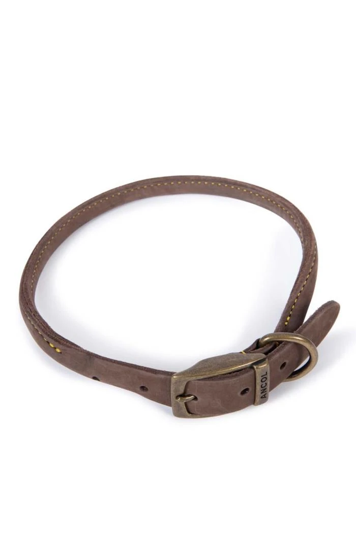This 22 inch round leather dog collar is a distinctive design made in premium top-grain bridle leather. Created for dogs with longer coats, it features a robust nylon core and an antique gold-effect buckle and D-ring for a stylish finishing touch.