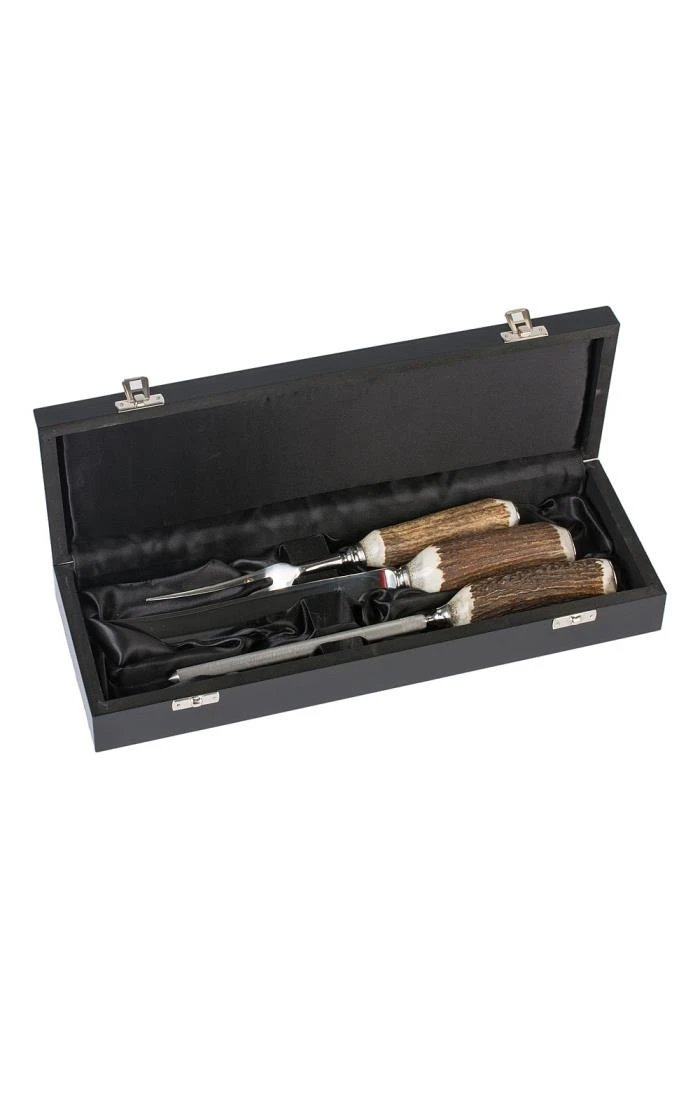 Made from the antlers of the Scottish Red Deer, this handcrafted three piece carver set features a two pronged fork, carving knife and knife sharpener, all with handles shaped from real antler. Each handle has a unique shape and colouration formed from this distinctive natural material, and a wonderfully tactile feel that no synthetic substance can match.