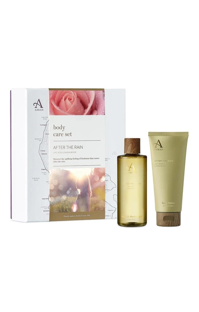The Arran Sense of Scotland (formerly Arran Aromatics) After the Rain Body Care set is infused with the essence of Scottish island living. Combining a refreshing bath and shower gel and a luxuriant body lotion in a presentation box, the zesty and woody fragrance evokes verdant forests and cottage gardens reawakening after gentle spring showers. Ideal for gifting.