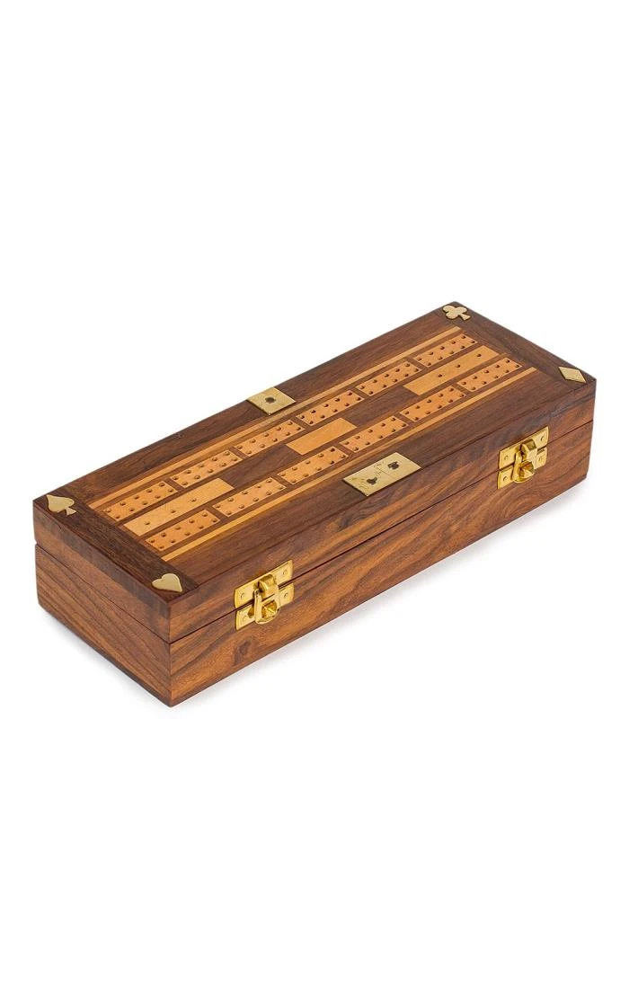 Be sure to impress when it comes to after-dinner games with this luxurious cribbage cards, dice and domino set. Crafted from premium shesham wood and brass, it features playing cards, high quality wooden dominoes and dice that are encased in a wonderfully striking wooden box.
