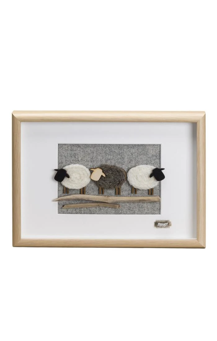 Natural materials reflect elements of the Scottish countryside in this driftwood framed triple sheep picture which is full of Highland character.