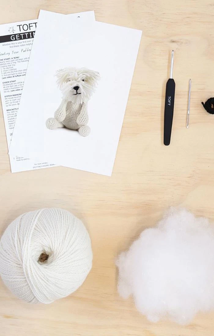 Knit yourself a super cute and cuddly friend with this Geoff the Westie crochet craft kit. Suitable for those with intermediate crocheting skills, this kit comes with everything you need to crochet your own soft toy including pure wool yarn, polyester toy stuffing, a pattern card to follow and a crochet hook and needle.
