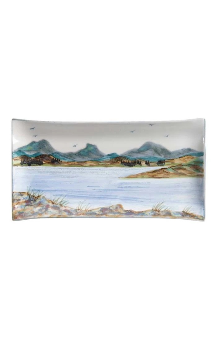 This 34cm rectangular plate from Highland Stoneware features a beautifully rendered hand-painted scene that can be used as a serving dish or hung on the wall as decoration through holes at the base. Always exquisitely detailed and full of life and colour, no two designs are ever exactly alike, making each plate a work of art in itself.