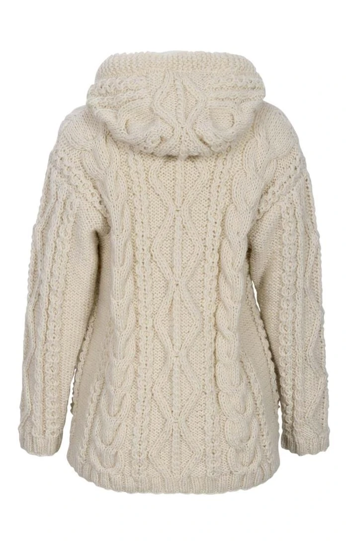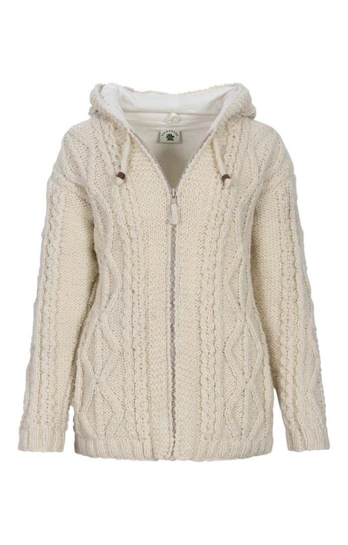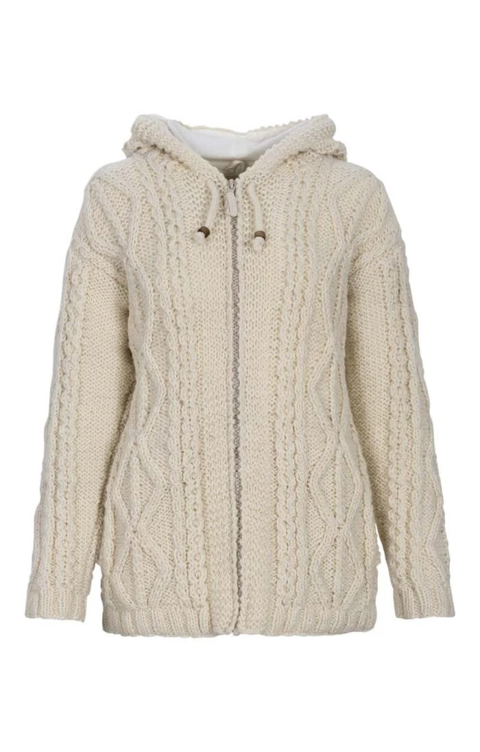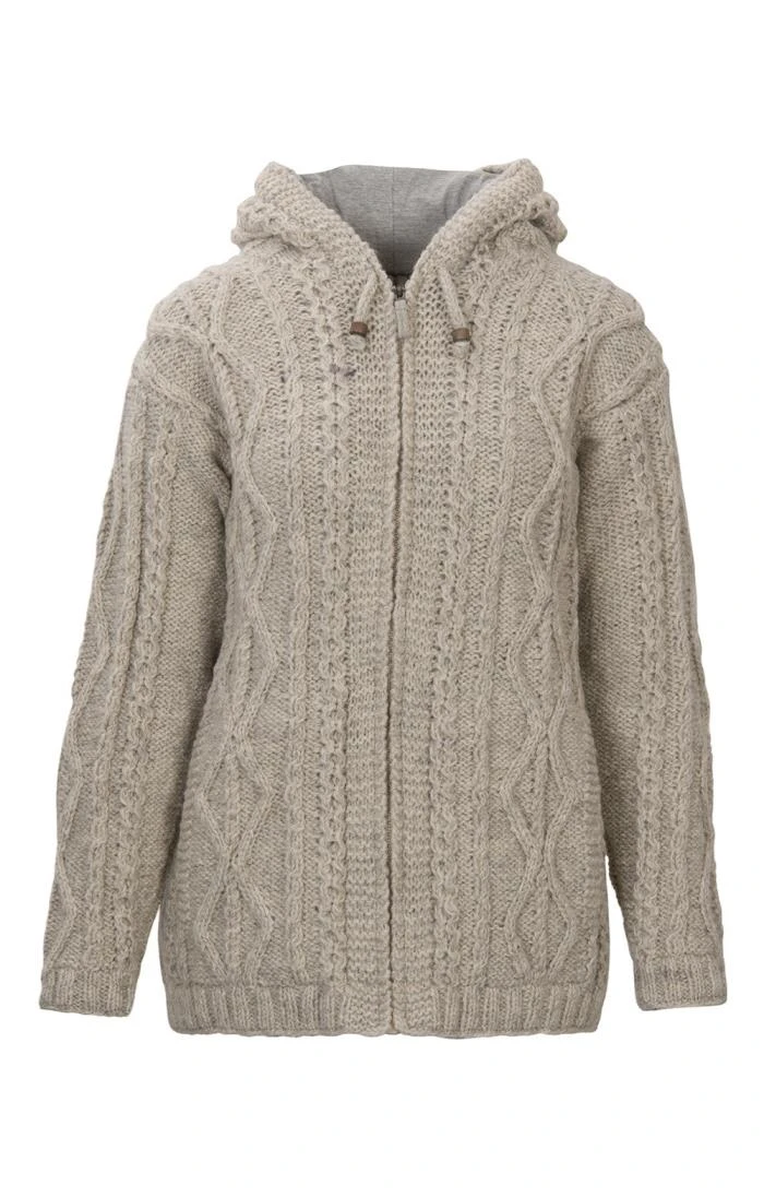 Knitted, pure wool Hoodie guaranteed to keep warm and toasty this winter. Our ladies Aran style wool hoodie comes in variety of colours and will complement any winter look. Cotton jersey lined for comfort and with a cable knit pattern, this is a perfect gift for a loved one or an unusual and indulgent winter treat for yourself.