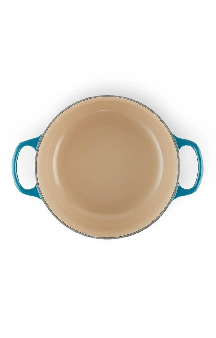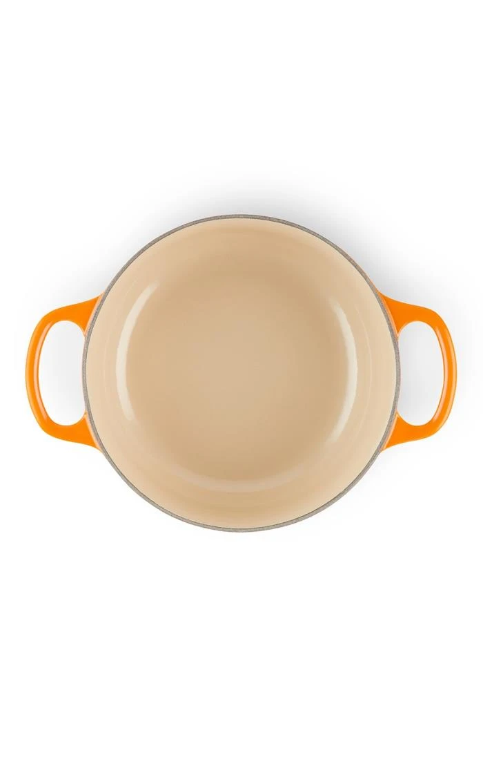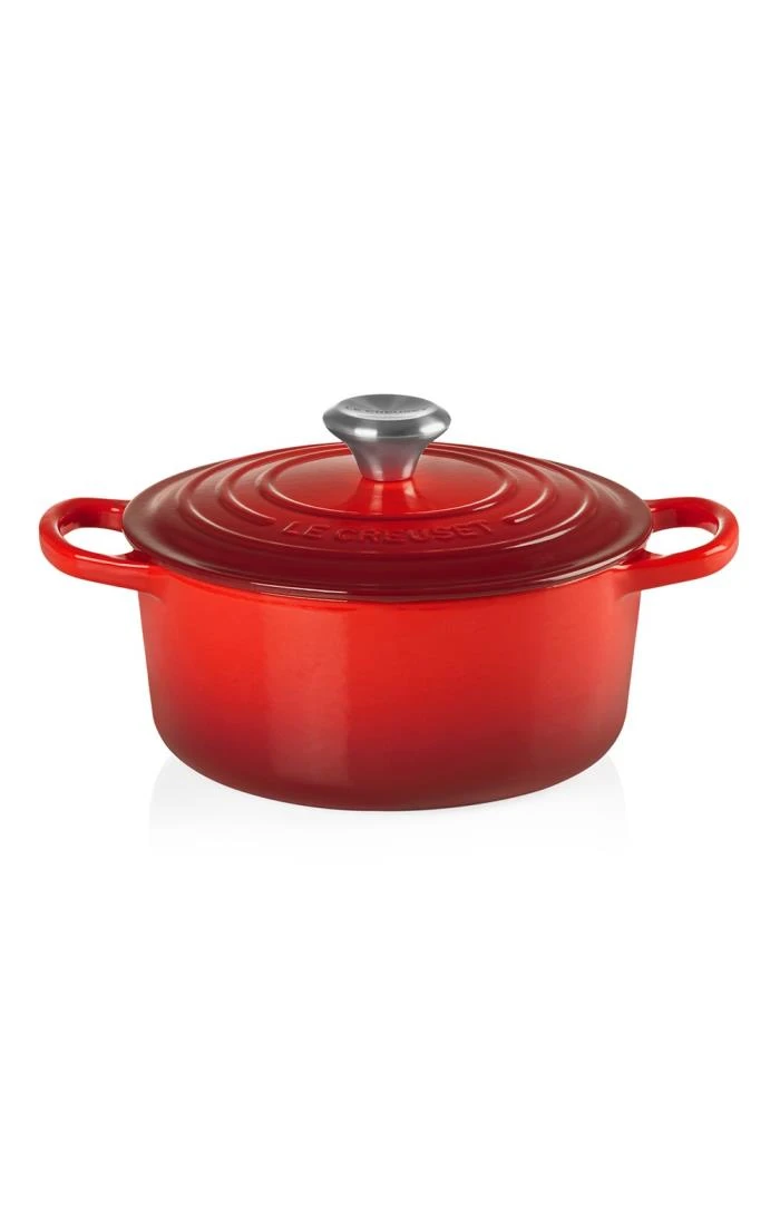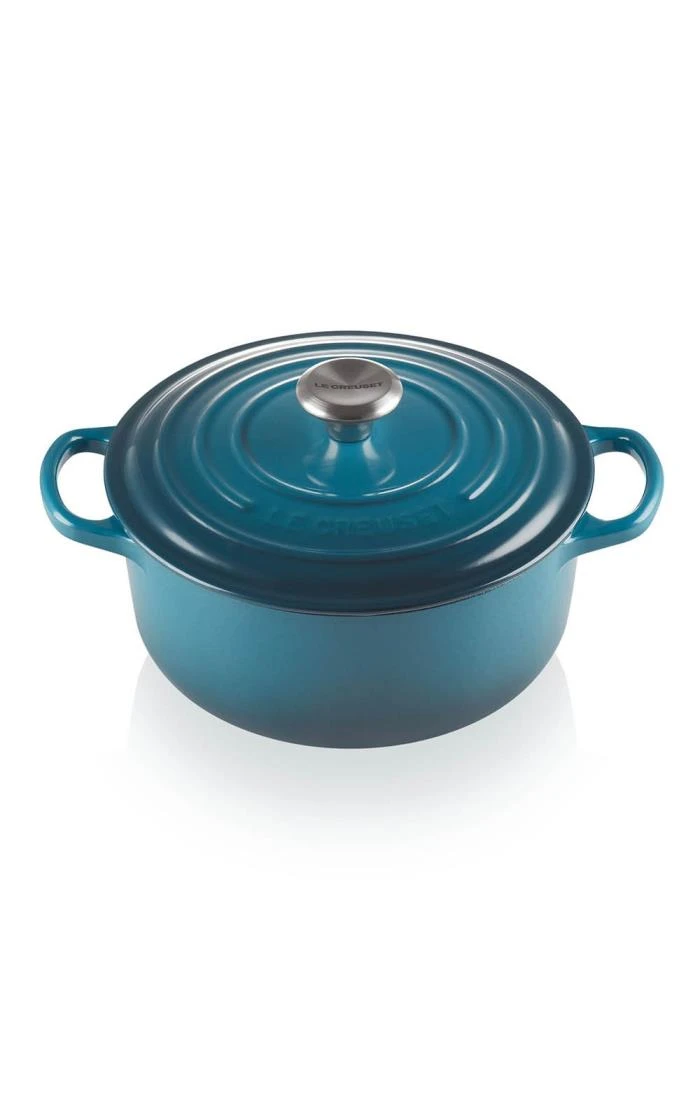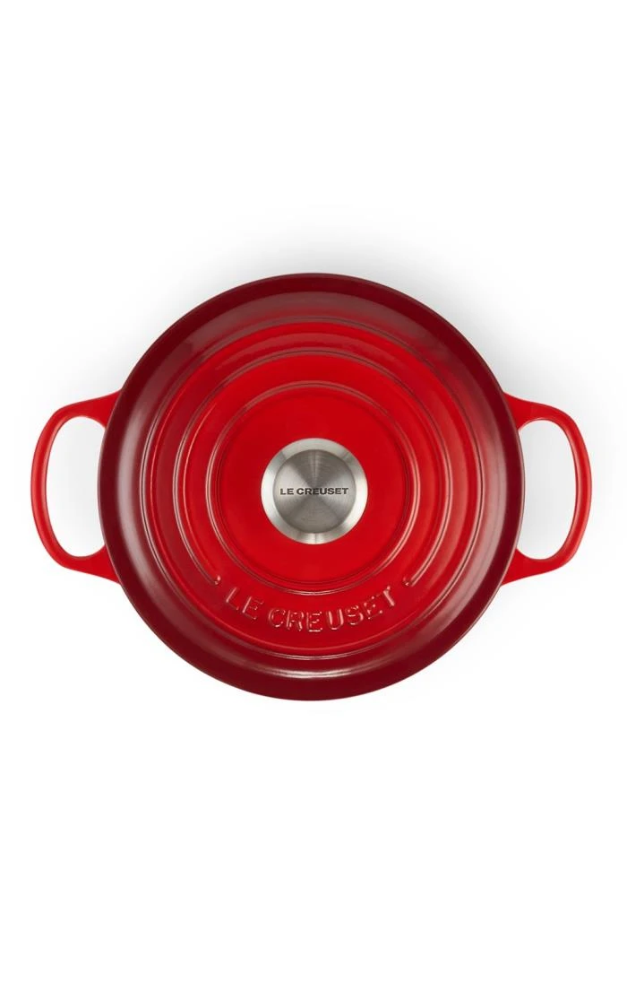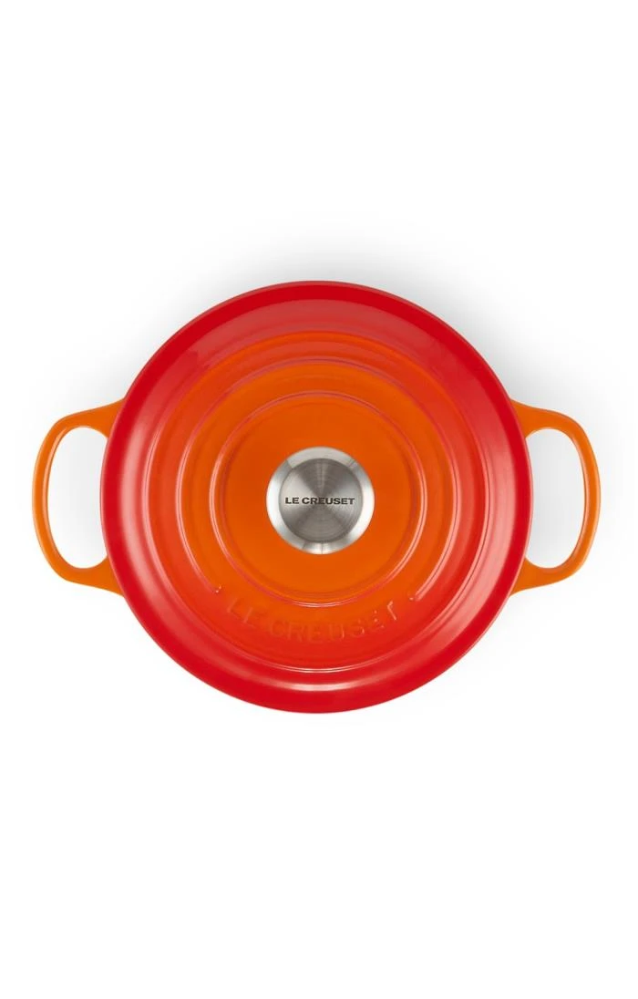 This cast iron and enamel 24cm round casserole dish by Le Creuset is suitable for all types of hobs, ovens and grills and is smart enough to take centre stage on your dining table. The well-fitting lid retains moisture for delicious stews, soups, casseroles and roasts that also benefit from its even cooking performance and heat retaining properties. Easy to work with with its grippy lid knob and sizeable handles, you’ll feel every inch the cooking pro with this iconic pot on your kitchen team. Protected by a lifetime guarantee.