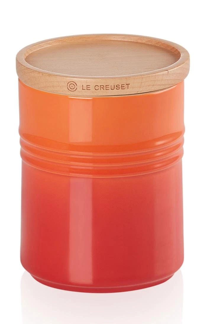 An impressive blend of form and function, this glazed stoneware medium storage jar by Le Creuset is the stylish way to keep key ingredients fresh in the kitchen. With its sleek silhouette and hallmark three-ring Le Creuset design, this covetable container from the celebrated French kitchenware company will add an element of continental chic to every shelf or cupboard.