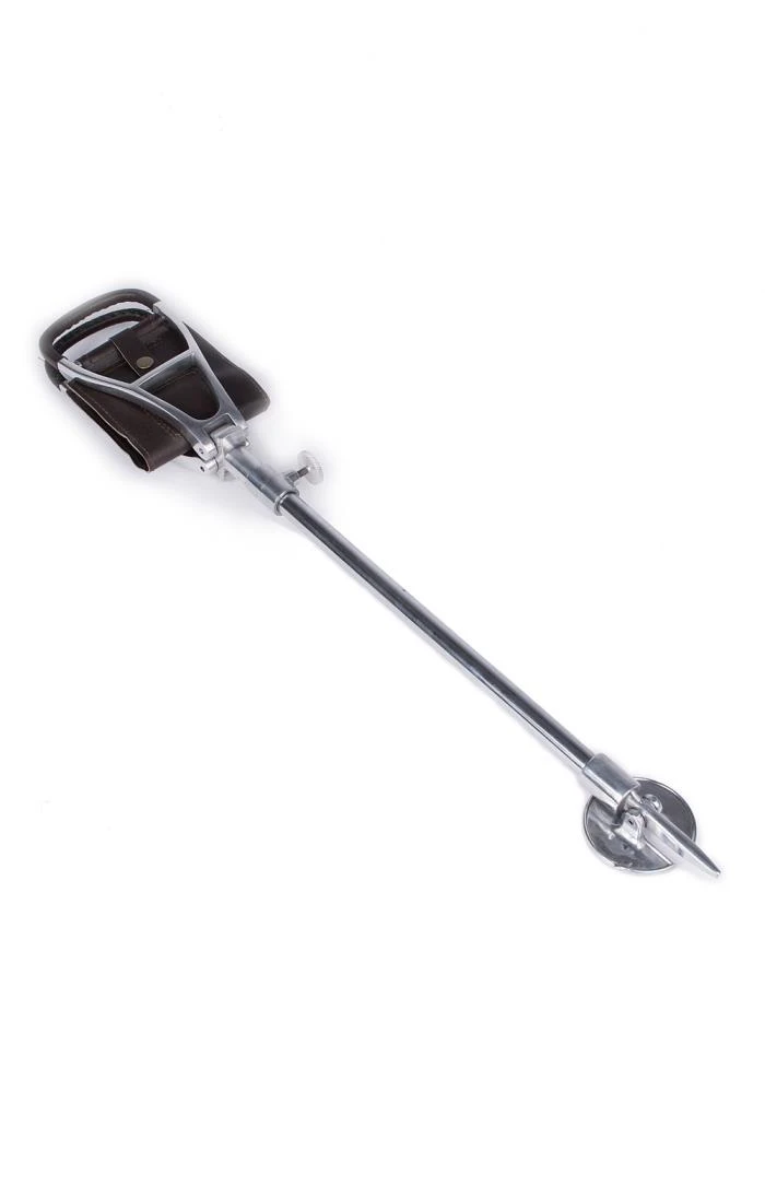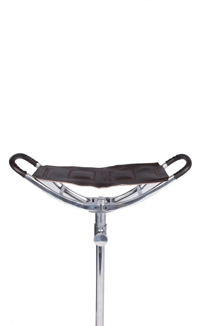 Width: 12cm.Composition: Stainless Steel & LeatherSilver shooting stick with Leather seat. Sharp point on bottom for putting in soft ground. Adjustable wheel. Height – 73cm