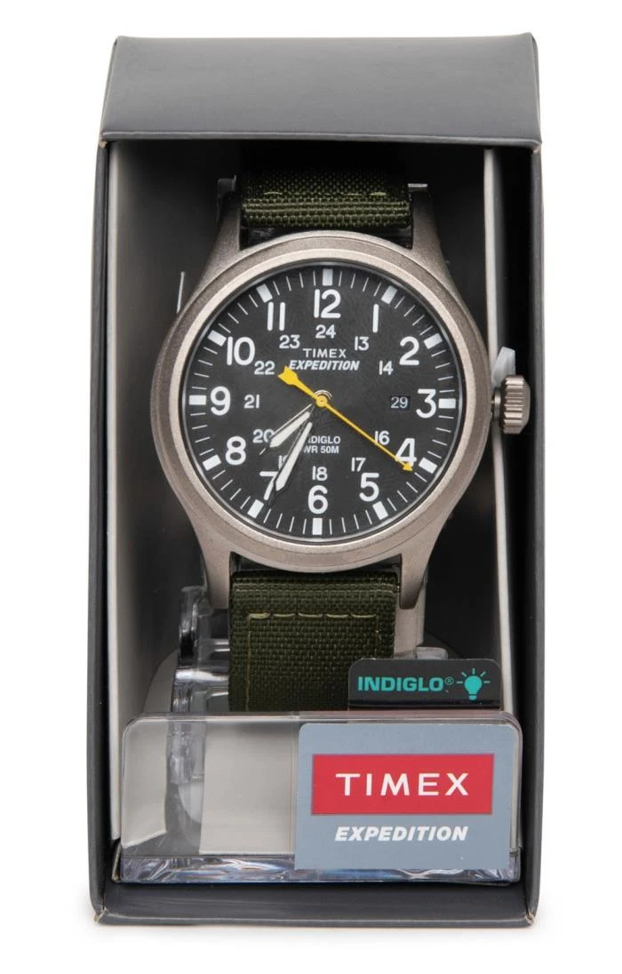 Keep track of time wherever your day takes you in the sporty and sturdy Timex Expedition Scout watch on your wrist. The bold white numerals stand out clearly against the black background for easy at-a-glance reading, while the adjustable fabric strap fastens safely and comfortably without slipping around. Water resistant up to 50 metres.
