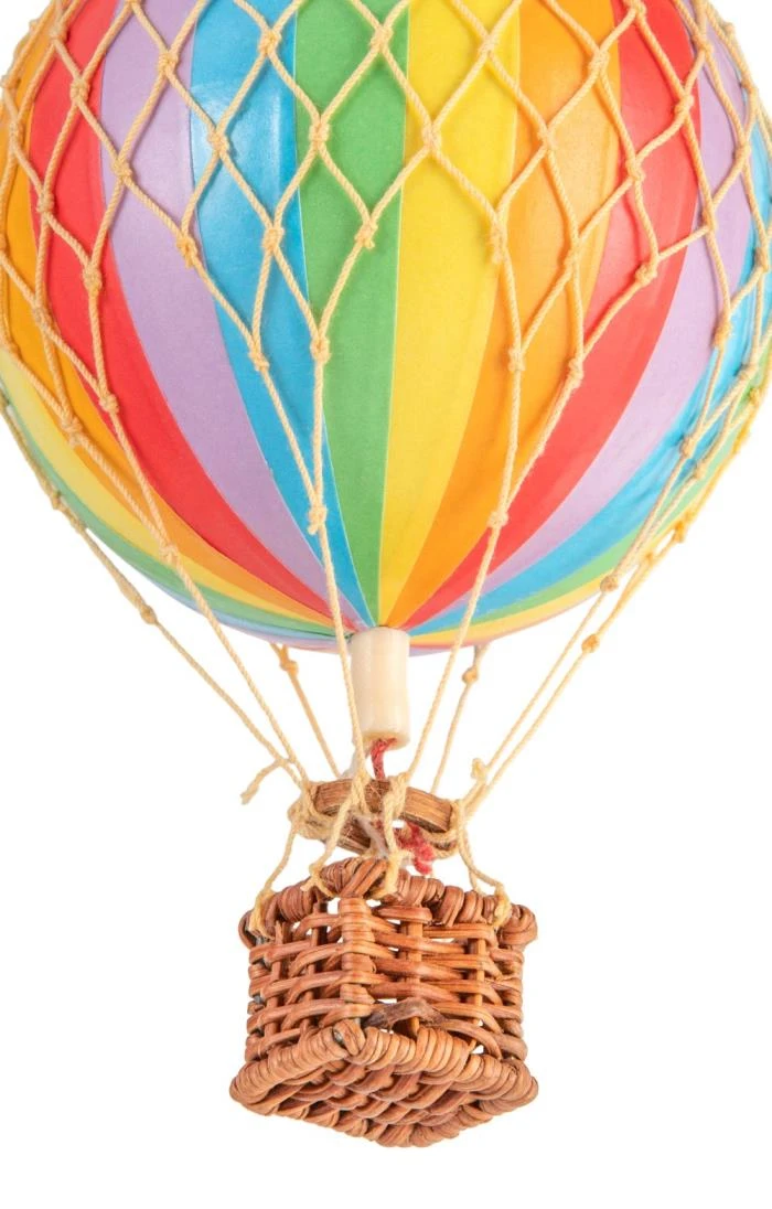 Celebrate a golden age of flight with this beautifully crafted mini hot air balloon. With hand knotted netting, wooden toggles and an intricately woven rattan basket, this cute and characterful mobile carries aloft dreams of leisurely flights through bright summer skies.