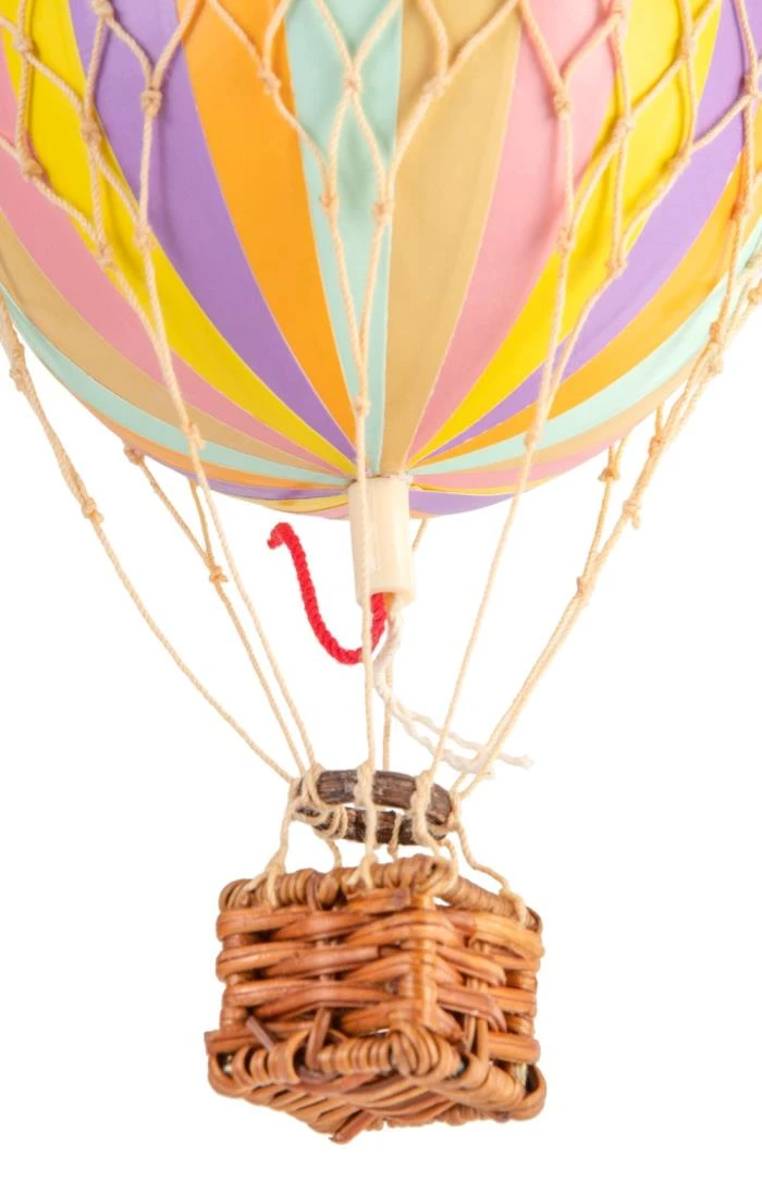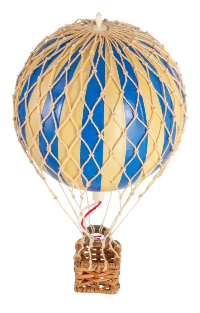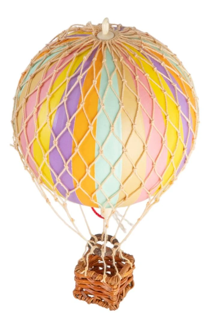Celebrate a golden age of flight with this beautifully crafted mini hot air balloon. With hand knotted netting, wooden toggles and an intricately woven rattan basket, this cute and characterful mobile carries aloft dreams of leisurely flights through bright summer skies.
