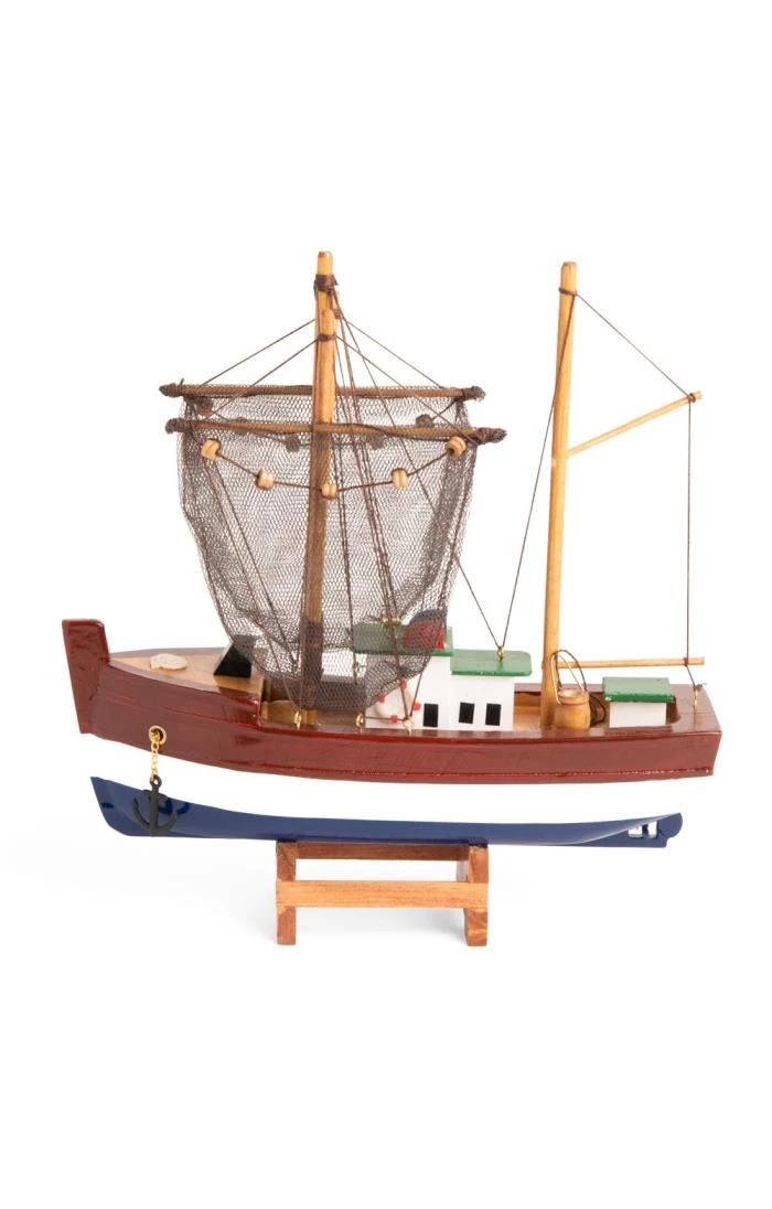 Explore Britain’s rich maritime heritage with this meticulously crafted model fishing boat. This exquisite wooden trawler, adorned with intricate details like fishing nets, buckets, and life rings, evokes the charm of Cornish harbours. A perfect decorative piece for nautical-themed rooms, it adds a touch of coastal nostalgia to your living space. Whether perched on a shelf, window ledge, or mantel, this wooden marvel serves as a timeless reminder of the allure of the sea.