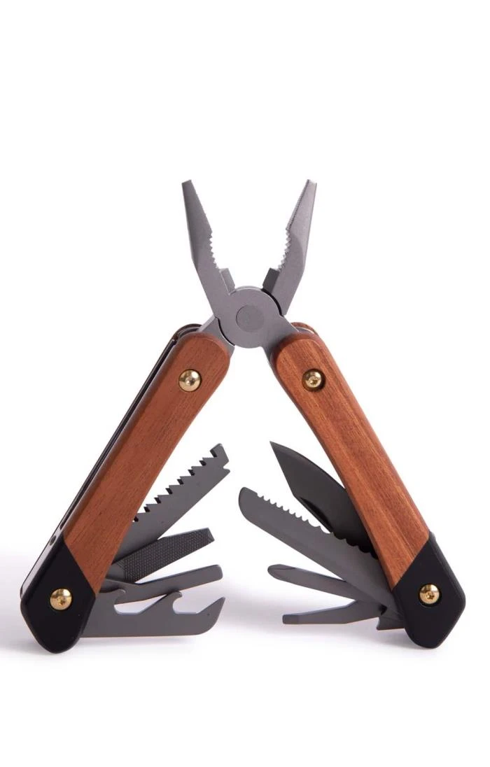 Make light work of jobs around the house with this stylish and practical plier 12-In-1 multitool. No need to dig around in the tool box – the smooth wooden handle contains a useful assortment of utensils including pliers, wirecutters, screwdrivers, a file, a bottle opener and knives.