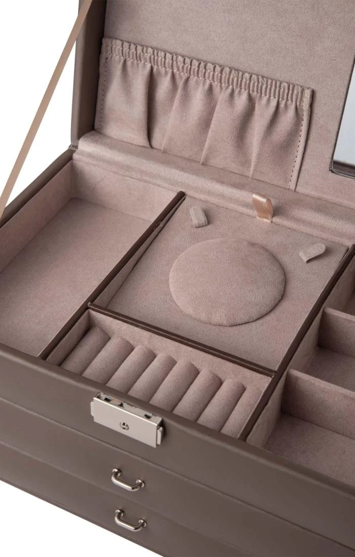 This generously sized jewellery case is a rectangular two drawer box with plentiful compartments and sections to keep all your precious possessions neatly organised and separated. The hinged lid opens to reveal a mirror, hooks for necklaces and an elasticated pocket. The lockable top section has a mix of padded sections for rings and earrings and a lift-up necklace/bracelet holder. Two drawers to the bottom open to reveal further compartments for keepsakes and treasures.