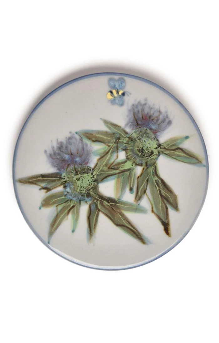 This small round celadon stand is a fine example of hand-thrown greenware pottery made with classic British artistry. With multiple practical uses from pot trivet to cheese board, it also makes a beautiful decoration or wall hanging. These exquisite hand-painted pieces are completely unique, with individual brushstrokes that demonstrate the exemplary skill of its painter.