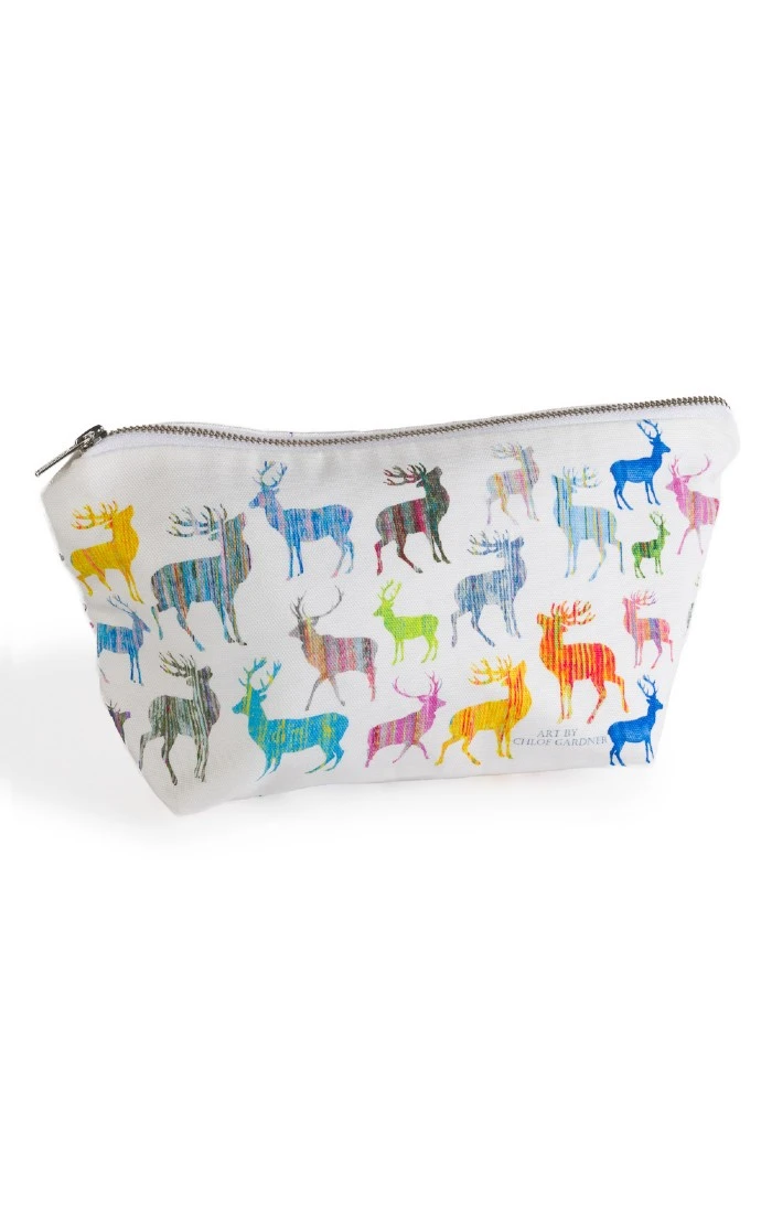 This spacious cotton canvas Stag washbag has all the room you need to take your toiletries with you on weekend trips, city breaks and summer holidays. The multi-coloured all-over patterns add a colourful and quirky touch to your travel kit, while the wipe-clean interior, square base and wide zipped opening prioritise ease of access and convenience.