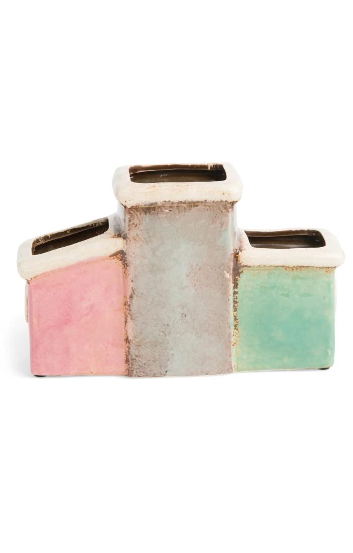 This vibrant and charming ceramic three house planter makes a delightful addition to your home. This unique piece, measuring approximately 21 cm in width, 13 cm in depth, and 8 cm in height, depicts three quaint houses, offering an ideal opportunity to infuse colour onto window ledges, terraces, or decking. The planters are a textured masterpiece reminiscent of the rustic allure and nostalgic grace of coastal cottages in Scotland. Crafted with precision by skilled artisans, it stands as a truly distinctive and exceptional gift choice, perfect for adding character and charm to any living space.