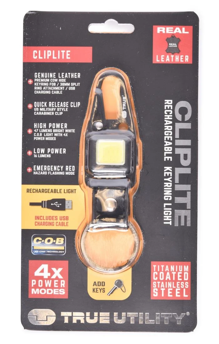 A cleverly designed tool, this True Utility Cliplite is a multi-function gadget you’ll have lot of use for. Designed with a carabiner clip at one end and a metal split ring keyring at the other, it features a rechargeable light with standard torch function and a flashing red hazard warning function.